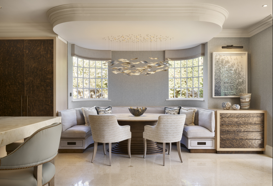 Kitchen re-design with bespoke cabinetry, upholstery & lighting.